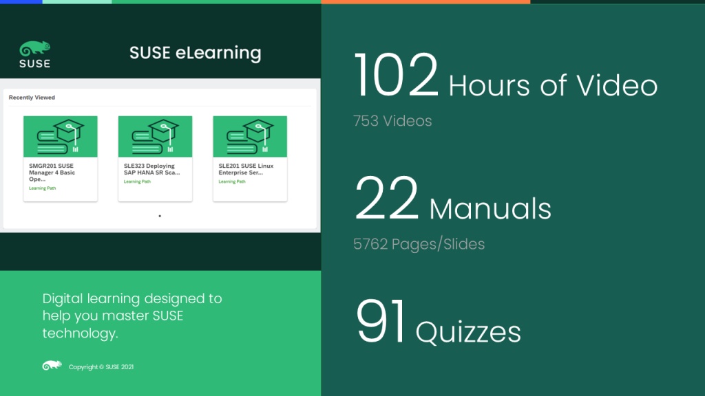 SUSE eLearning, anunciado el 9 de marzo de 2021, es una plataforma digital rentable basada en suscripción diseñada para brindar a los clientes las habilidades que necesitan, en cualquier momento y en cualquier lugar. Desde videos pequeños para resolver un desafío inmediato o rutas de aprendizaje estructuradas que conducen a la certificación, SUSE eLearning es la forma instantánea e inteligente de capacitar.