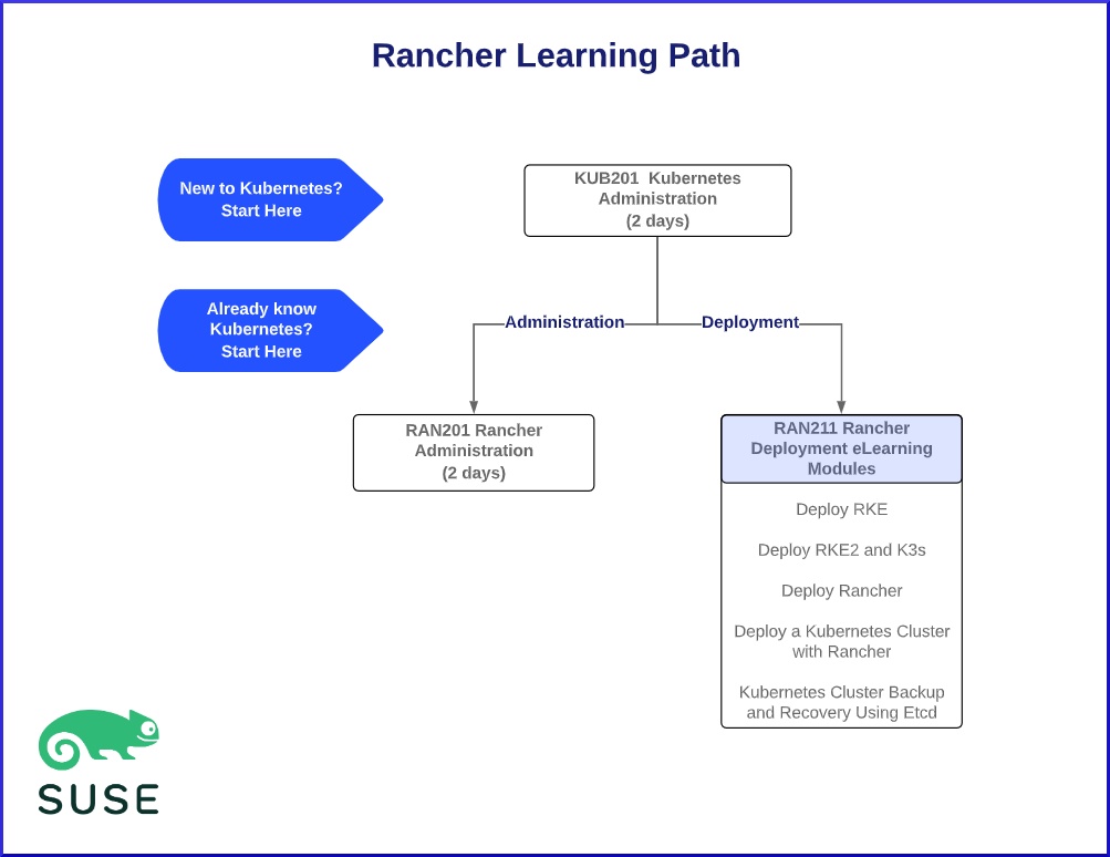 SUSE Technical Product Training se complace en anunciar tres nuevos cursos de formación técnica de productos, incluidos los dos primeros cursos de Rancher, que ya se han lanzado y están disponibles para ser programados para los clientes. Próximamente también estará disponible la primera certificación SUSE para productos Rancher.