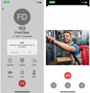 El nuevo cliente de iOS ahora es compatible con el códec H264. Esto le permite realizar videollamadas a teléfonos SIP compatibles con H264, así como contestar un teléfono de intercomunicador con capacidades de video. Los visitantes pueden simplemente presionar el botón de marcación rápida asignado a su extensión y recibirá una llamada normal, con un cuadro de diálogo para elevar a una videollamada para aquellos timbres que admitan el códec H264. Luego, se puede abrir la puerta ingresando un código que está preconfigurado en la WebUI del teléfono de la puerta a través del teclado.
