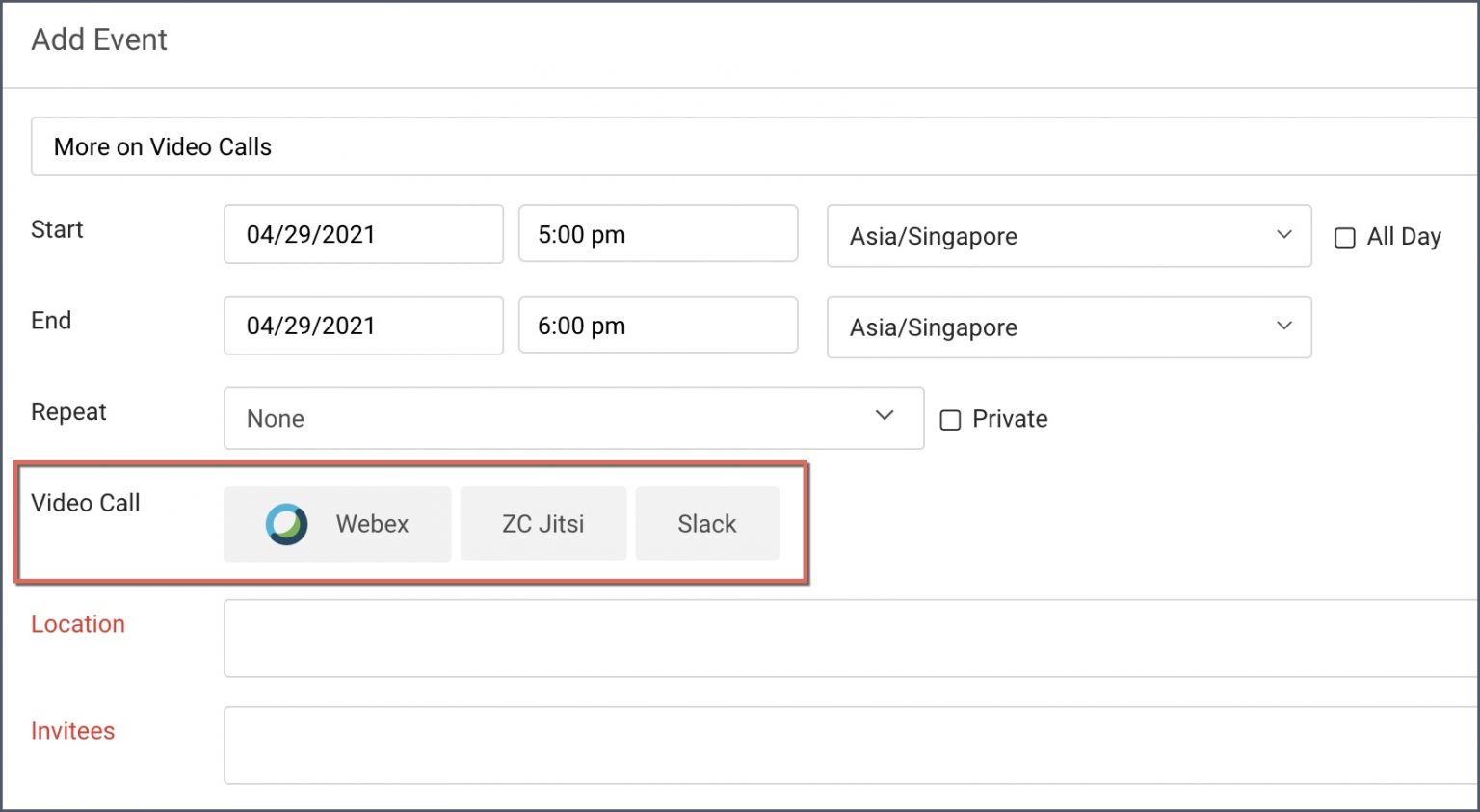 Ahora puede hacer clic en un botón de videollamada para agregar la URL de su sala de reuniones personal a cualquier reunión. Es fácil.