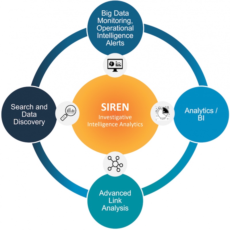 En Siren, se creo una plataforma que se utiliza para la "inteligencia de investigación" en el cumplimiento de la ley, la inteligencia y el fraude financiero. La inteligencia de investigación es una especialización del análisis de datos que satisface las necesidades de aquellos que normalmente buscan malos actores. Estas investigaciones son el foco principal de la aplicación de la ley y la inteligencia, pero también son fundamentales para descubrir actividades delictivas financieras y para la caza de amenazas en la ciberseguridad.