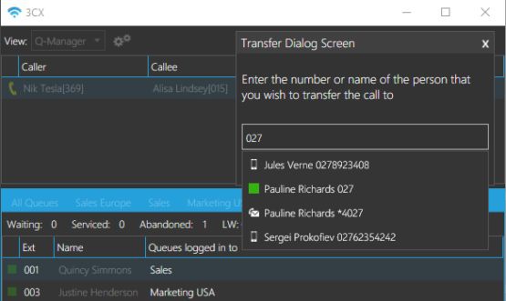 La última versión de la aplicación de Windows ofrece la capacidad de transferir llamadas al correo de voz de una extensión desde la vista "Recepcionista", "Q-Manager" o "Administrador". Esto extiende la funcionalidad de transferencia mientras administra las llamadas en cola en una de las vistas dedicadas de la aplicación.