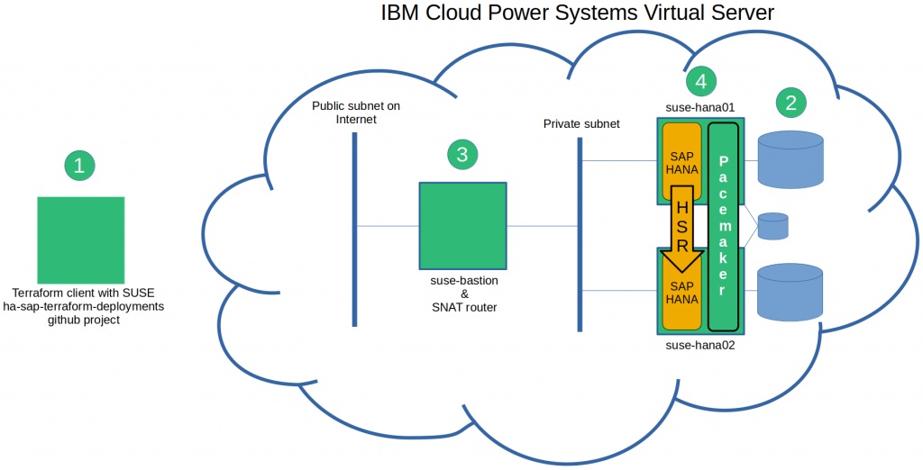Se publicó un video de YouTube de 10 minutos que demuestra la configuración de terraform y salt junto con la implementación de una replicación del sistema SAP HANA de alta disponibilidad en servidores virtuales Power en IBM Cloud, todo siguiendo las mejores prácticas de SUSE. A continuación se muestra el diagrama de lo que se implementa en el video junto con una explicación de alto nivel de los pasos para preparar y ejecutar la automatización de Terraform y Salt que el video explica en detalle: