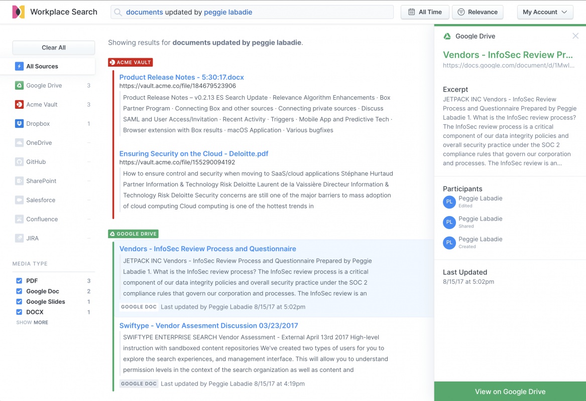 Y con los recientes cambios hacia un trabajo más virtual, hacer que la información sea fácilmente accesible y fácil de encontrar se ha vuelto más importante que nunca. Elastic Workplace Search ofrece todos los documentos, hojas, diapositivas y toda su otra imagen, PDF y otro contenido no relacionado con Google compartido en Google Drive en una sola experiencia de búsqueda.