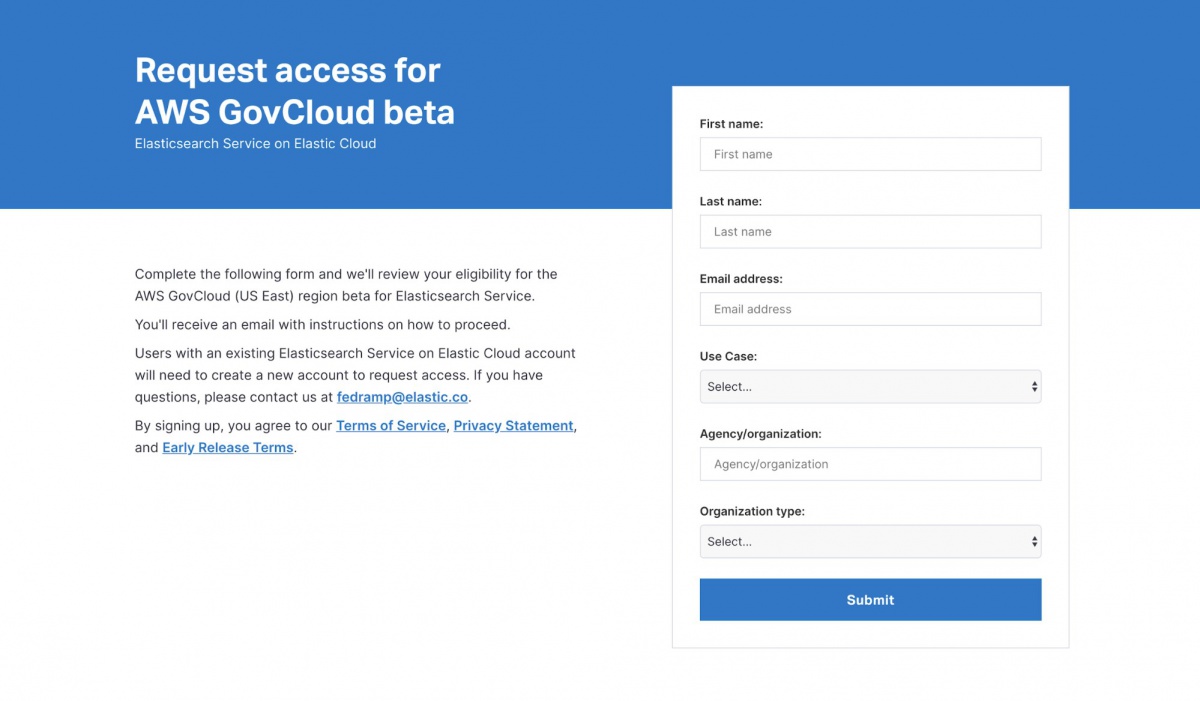 Si es un usuario nuevo o existente que maneja datos para una entidad del gobierno federal, estatal o local de los EE. UU. , O una institución educativa, complete este breve formulario para solicitar acceso al Servicio Elasticsearch en AWS GovCloud. Todas las implementaciones beta heredarán automáticamente la futura autorización de FedRAMP otorgada en el entorno sin ninguna acción necesaria.