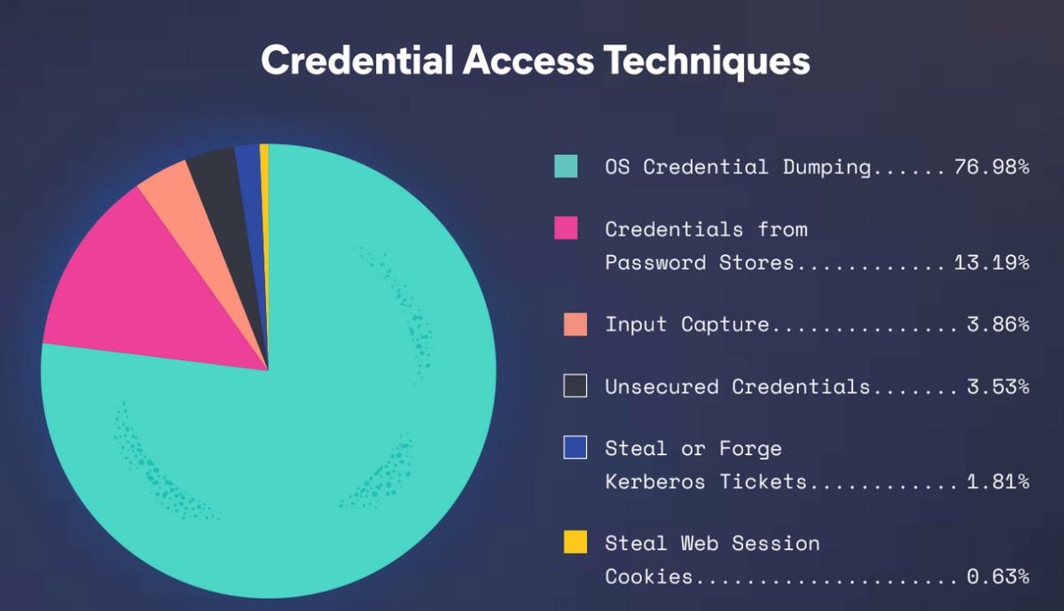 En 2022, se vio más de 4500 intentos de acceso a credenciales utilizando las siguientes técnicas (todas disponibles para la comunidad a través de los repositorios de reglas de detección o artefactos de protección en formatos de reglas compatibles):