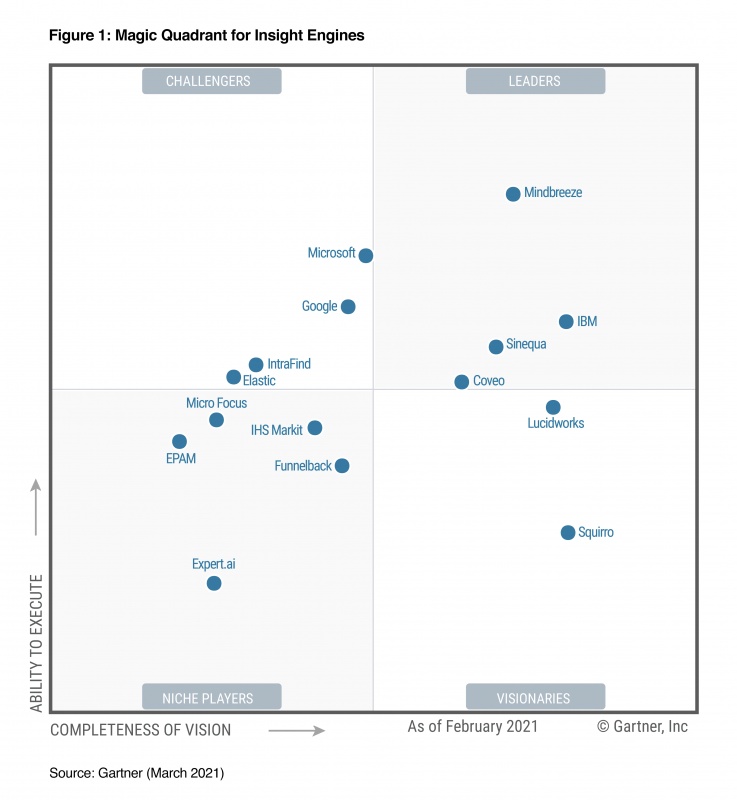 Gartner, "Cuadrante mágico de Gartner para motores de conocimiento"; Anthony Mullen, Stephen Emmott, marzo de 2021 .