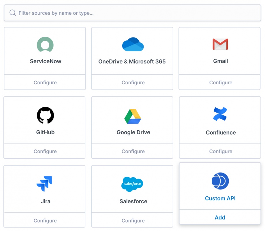 Para cualquier otra fuente de datos que le gustaría conectar, puede usar las numerosas integraciones de fuentes de contenido con herramientas populares, o usar la API de fuente personalizada para todo lo demás. Todas las fuentes disfrutan del mismo filtrado automático en el momento de la consulta, la priorización de fuentes y la visualización personalizable de resultados.