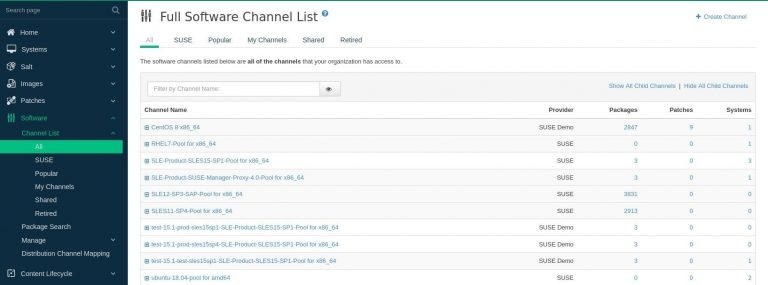 Desde dentro de SUSE® Manager, puede seleccionar canales de software como fuentes, ajustarlos según sea necesario para su entorno y probarlos minuciosamente antes de instalarlos en sus sistemas de producción. Desde el principio (desarrollo original), hasta la mitad (pruebas), hasta el final (implementación).