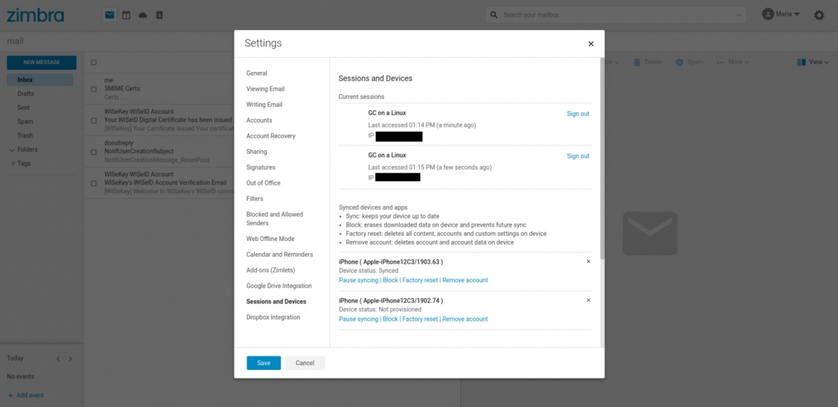 El Zimlet de administración de sesiones de usuario le permite ver todas sus sesiones activas y dispositivos móviles sincronizados desde la interfaz de usuario moderna sin preguntarle a su administrador. Para encontrar el Zimlet, haga clic en el menú de engranajes -> Configuración -> Sesiones y dispositivos.