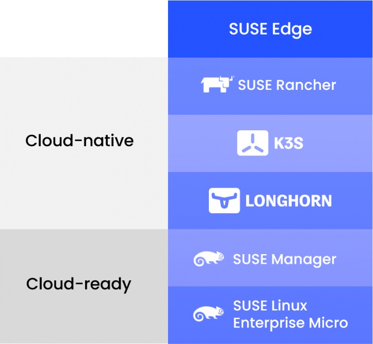La solución SUSE Edge sirve a un amplio conjunto de casos de uso que van desde organizaciones que están preparadas para la nube hasta organizaciones preparadas para la nube nativa. La solución es modular. Cuando se combina con SUSE Manager o una herramienta de administración de código abierto, puede usarlo para casos de uso de borde que no están completamente en contenedores. Para casos de uso de borde que están completamente en contenedores y son nativos de la nube, SUSE Rancher puede habilitar la administración del ciclo de vida de las implementaciones de Kubernetes a escala de borde.