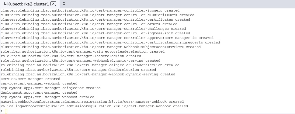 Para instalar la última versión de cert-manager, en la interfaz de usuario del servidor de Rancher, haga clic en la esquina más a la izquierda cerca del logotipo de Rancher -> Inicio -> rke2-cluster1 -> icono de Kubectl.