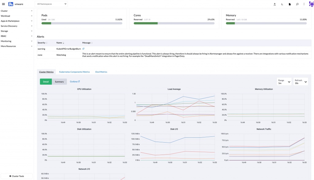 Los flujos de trabajo y la navegación en la plataforma se han rediseñado para ayudar a los operadores y desarrolladores de TI a trabajar con mayor eficiencia. Por ejemplo, la navegación al explorador de clústeres, el mercado y la supervisión ahora es aún más rápida con el nuevo panel de control deslizable. Esta experiencia simplificada brinda a los usuarios un fácil acceso a funciones críticas como paneles de desempeño de clústeres y administración e implementación de aplicaciones de clúster único y múltiple.