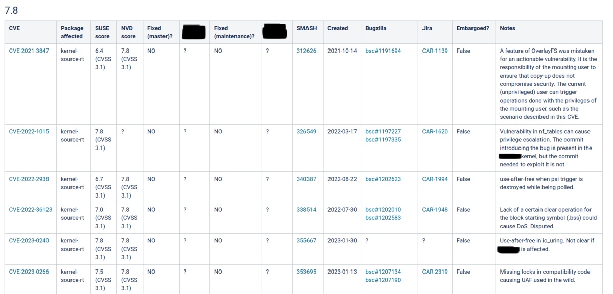 El equipo de ingeniería automotriz de SUSE mantiene una herramienta, llamada "cvetool", que procesa los datos CVE sin procesar de SMASH, extrae la información relevante y nos la presenta en un formato que facilita responder las preguntas de los clientes sobre CVE. Dado que esta información debe actualizarse continuamente, la automatización del proceso de actualización es crucial. Parte de la información específica del caso de uso automotriz y que necesitan nuestros clientes no está incluida en lo que obtenemos de SMASH , por lo que debemos agregarla, al menos para aquellos CVE cuya calificación de gravedad está por encima del umbral de informe del cliente. Por lo tanto, con la ayuda de cvetool, los datos seleccionados obtenidos de SMASH se combinan con los resultados de nuestras investigaciones internas para producir un conjunto de tablas CVE .que se almacenan en git y se cargan periódicamente en la instancia interna de Confluence de SUSE para su visualización y lectura . Esto también permite varias vistas y exportaciones de los datos: CVE ordenados por año, CVE corregidos en determinadas versiones, CVE destacados por paquete o puntuación de gravedad, etc. La herramienta también sabe cómo generar informes de CVE que se pueden adaptar para satisfacer las necesidades individuales de cada cliente. requisitos de conformidad.