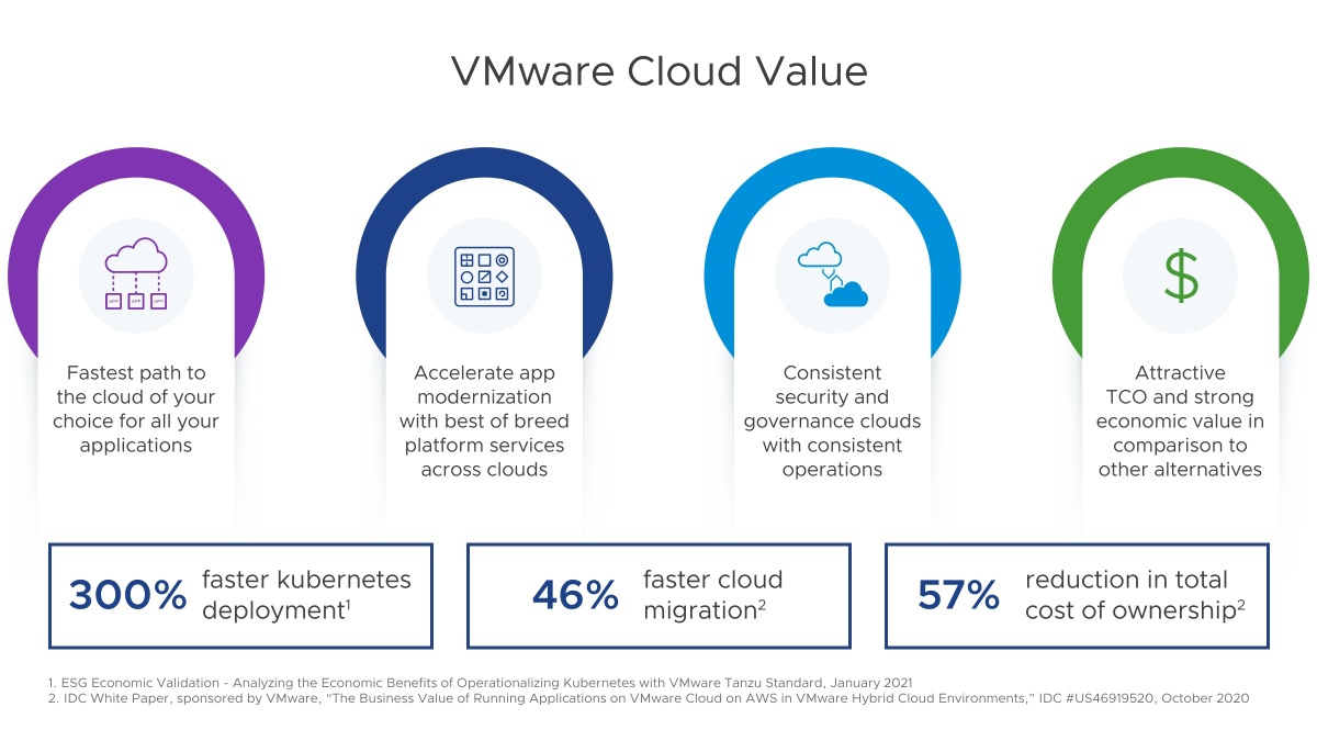 VMware Cloud hace que la ejecución de aplicaciones de vSphere comerciales en cualquier entorno de nube sea más sencilla y segura. Los estudios muestran que los clientes de VMware Cloud pueden lograr una implementación de Kubernetes un 300% más rápida, una migración de nube un 46% más rápiday una reducción del TCO del 57%.