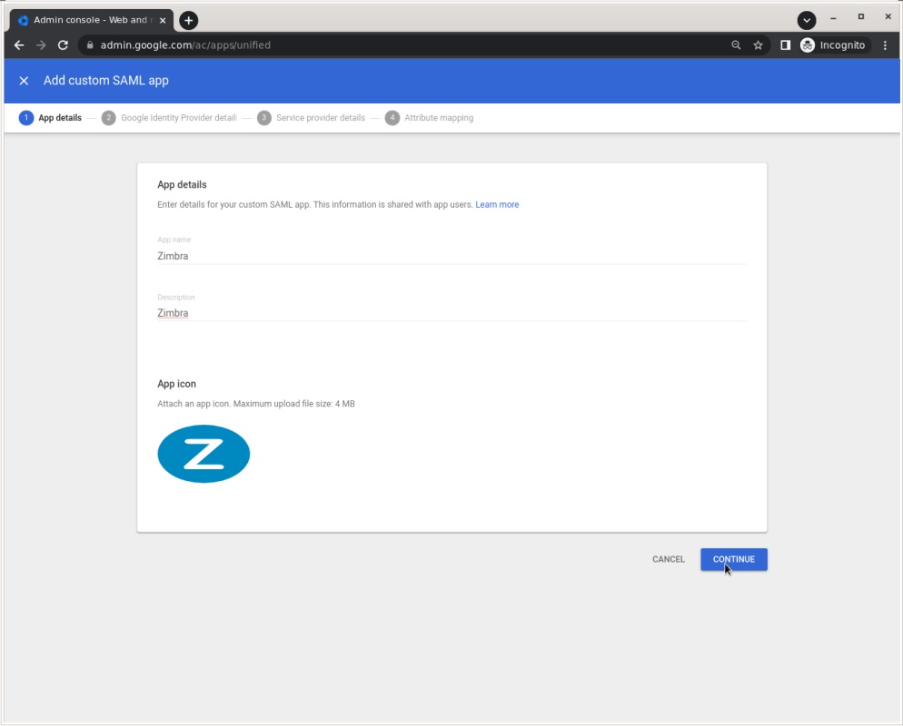 cp /opt/zimbra/extensions-network-extra/saml/samlextn.jar /opt/zimbra/lib/ext/saml/nsu zimbrancat /tmp/idpcert.pem |xargs -0 zmprov md barrydegraaff.nl zimbraMyoneloginSamlSigningCertn# zmprov mcf zimbraCsrfRefererCheckEnabled FALSOnzmprov mcf zimbraCsrfAllowedRefererHosts accounts.google.comn# nuevo desde 9.0.0 parche 25, debe configurar zimbraVirtualHostName:nzmprov md barrydegraaff.nl zimbraVirtualHostName zimbra10.barrydegraaff.nln/opt/zimbra/bin/zmlocalconfig -e zimbra_same_site_cookie="" #¡lea la siguiente sección!nreiniciar zmmailboxdctl