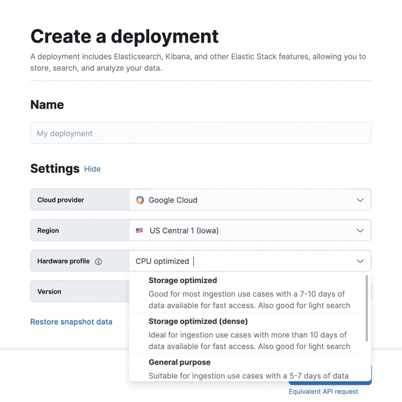 Elastic Cloud ofrece una serie de plantillas de implementación para ayudar a simplificar la selección de hardware. Estas plantillas se han adaptado para que coincidan con las nuevas configuraciones de instancias de la capa de datos activos. Puede optar por mantener oculta la complejidad y aceptar los valores predeterminados, o personalizar una configuración para que se adapte mejor a su carga de trabajo única.